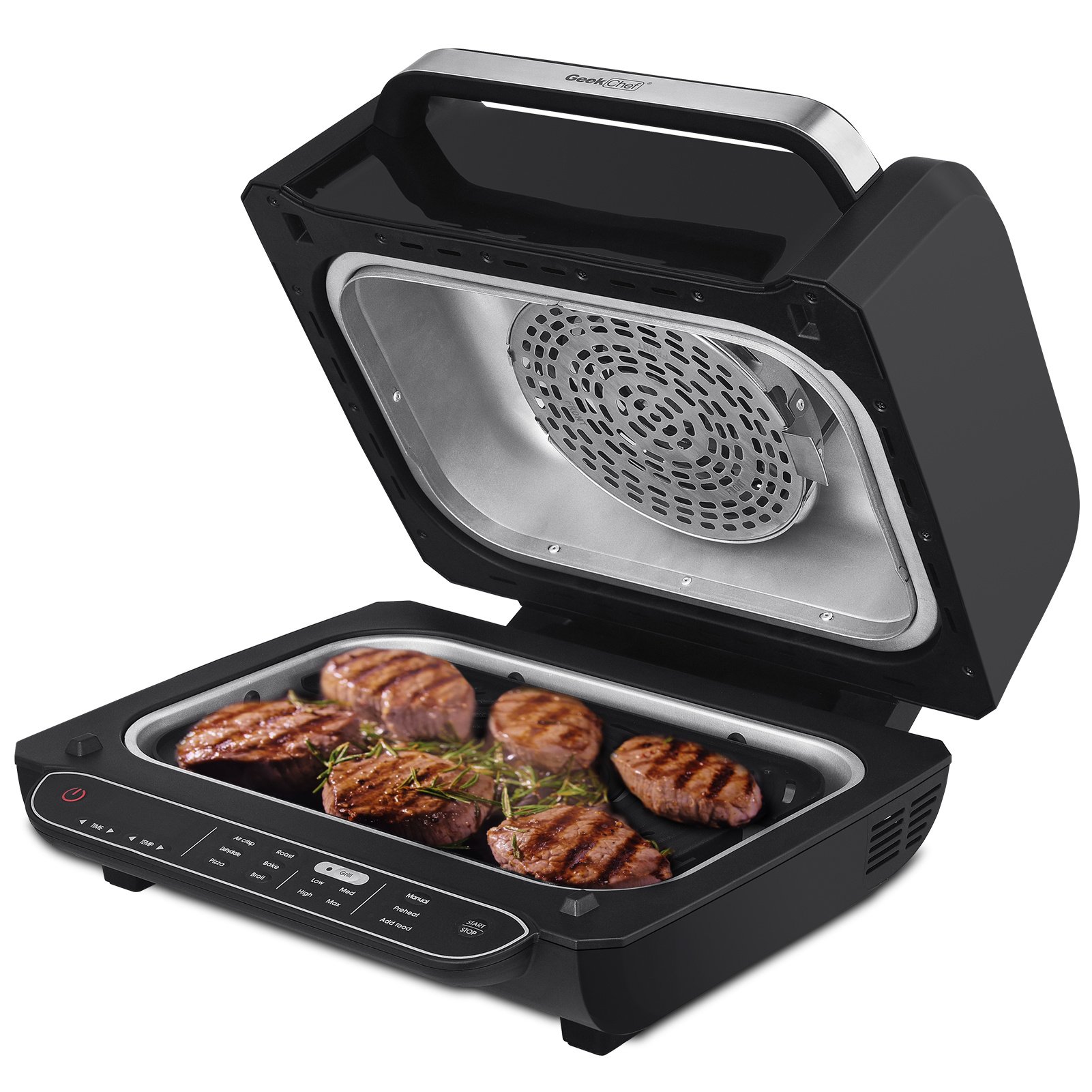 7-in-1 Functionality: Equivalent to an indoor electric grill with smart cook System. Grill your favorite food to the perfect food,it has 7 excellent cooking functions: Grill, Air Crisp, Bake, Roast, Broil, Pizza and Dehydrate.
